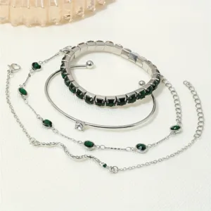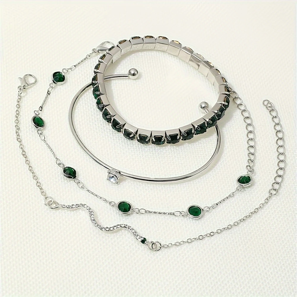 4pcs bracelet set with imitation green gemstones and rhinestones.