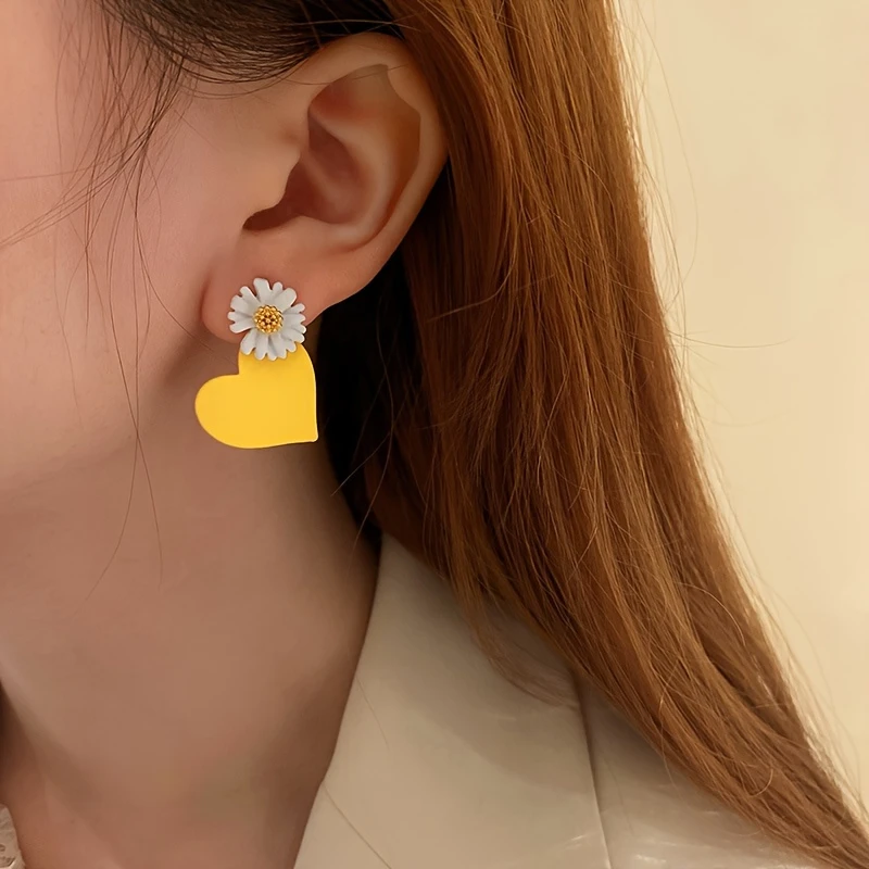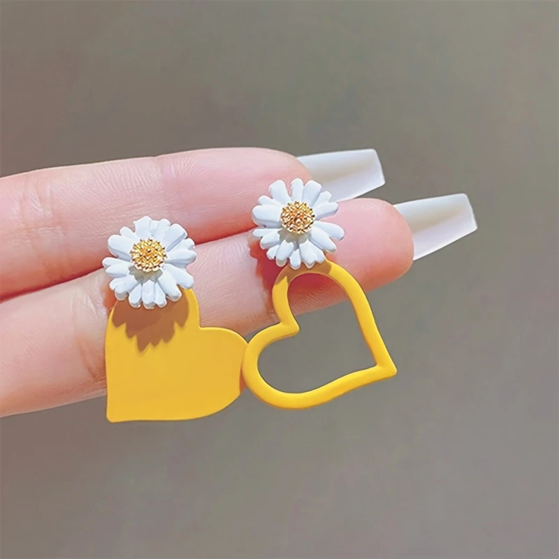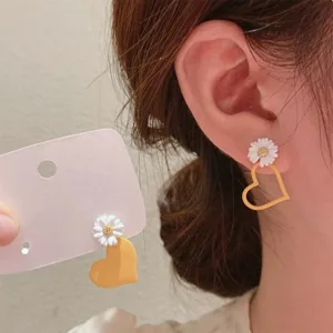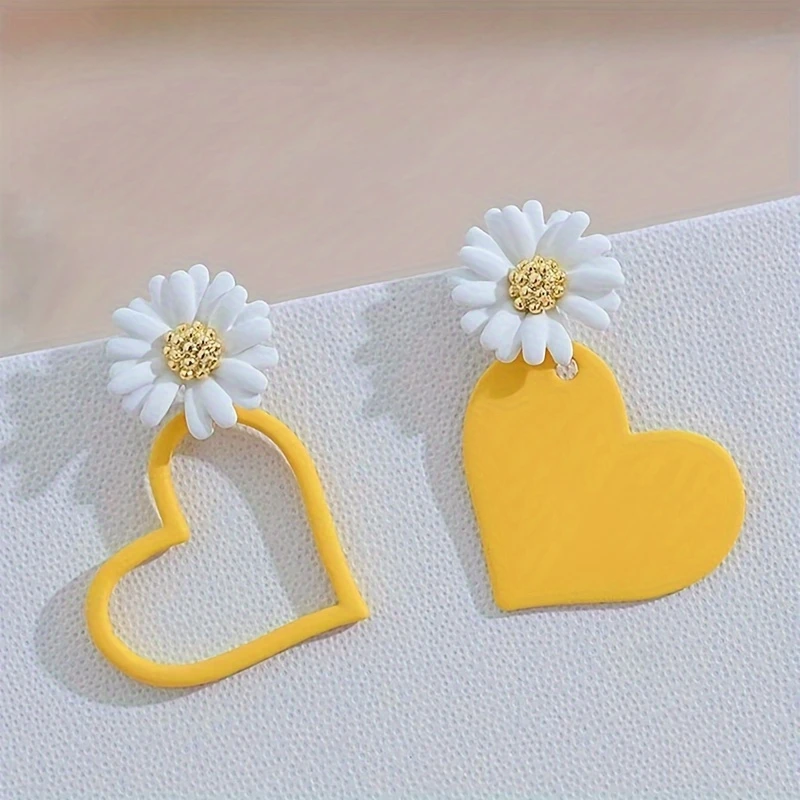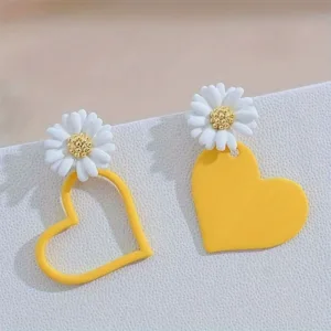Pair of asymmetrical drop earrings featuring a daisy and heart design.