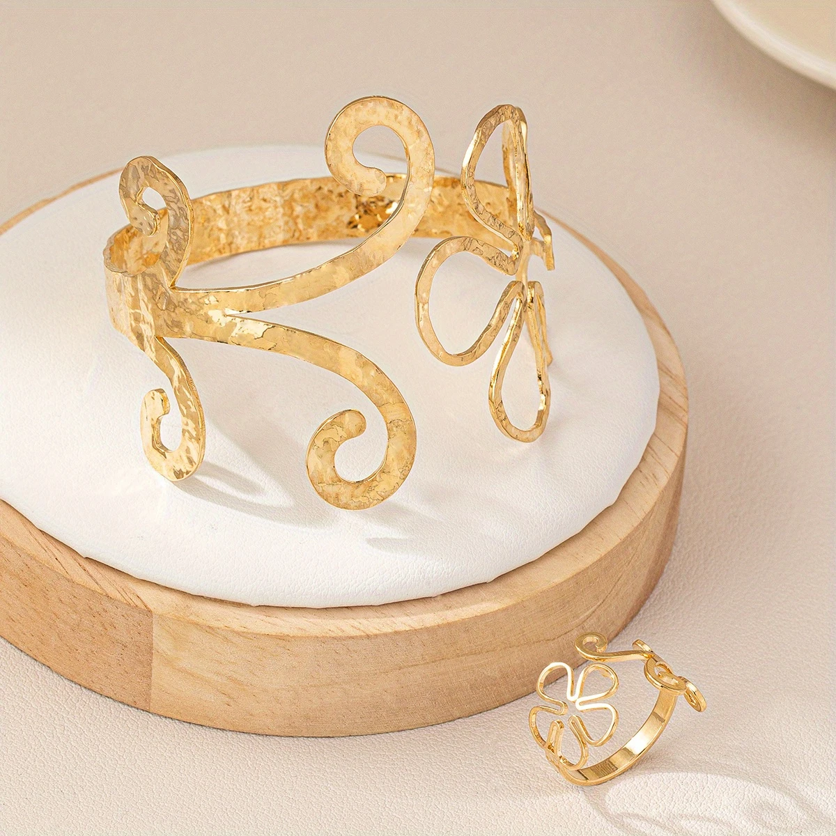 1 Set: Includes an adjustable open cuff bangle and matching ring