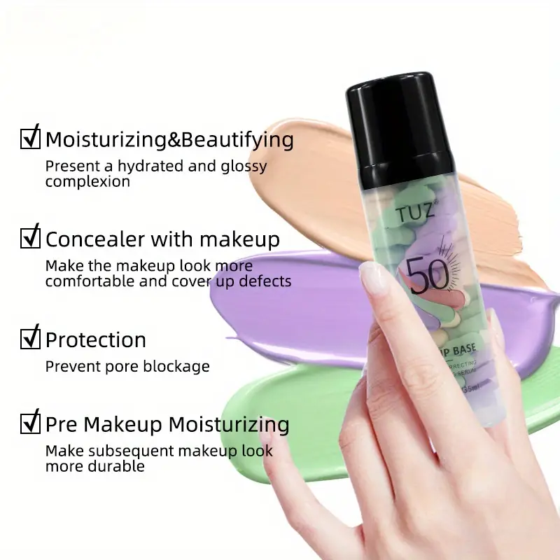 3-in-1 color correcting primer with green, peach, and purple tones.